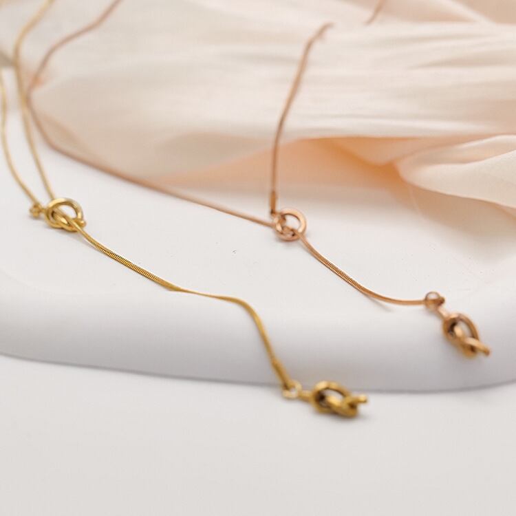 この特別なアクセサリーは、316Lのサージカルステンレスを使用し、独自のデザインがスネークチェーンと結び目のエレガンスを融合させています。