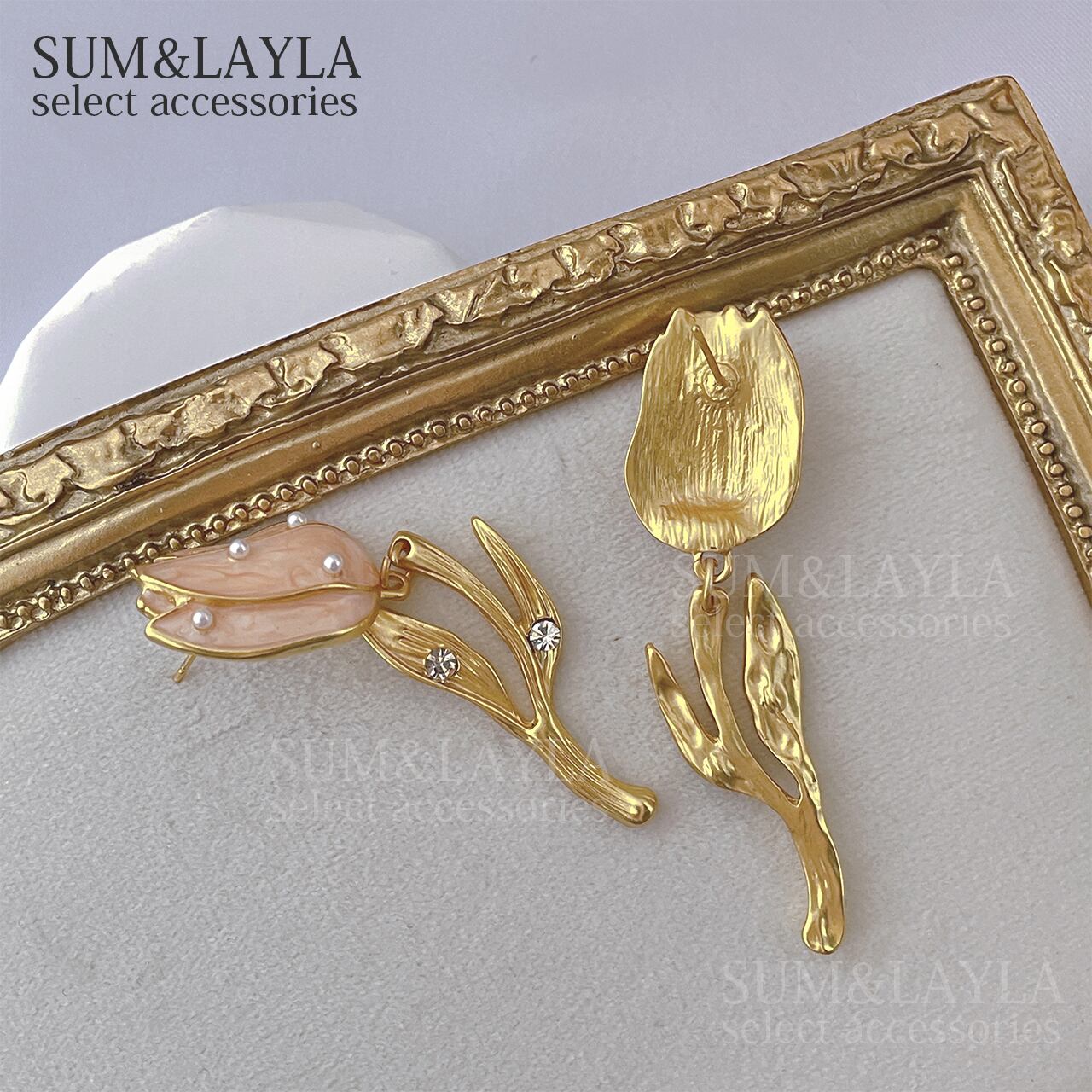 美しいチューリップの花をモチーフにした、可愛らしさと高級感が融合したビンテージ風ピアス。